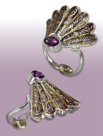 "When I started, I would complete the piece by lapping the enamels to a shiny finish," she says. On her "Wings of Color" collection of enameled insects, lapping a single butterfly wing could take up to three hours. "With this piece, I decided not to lap them and just leave the natural finish that comes out of the firing. It brings out the playfulness of the filigree and scrollwork."