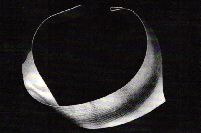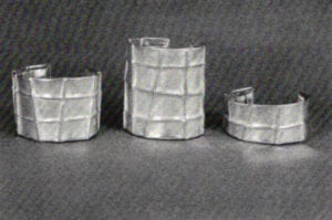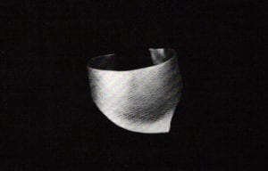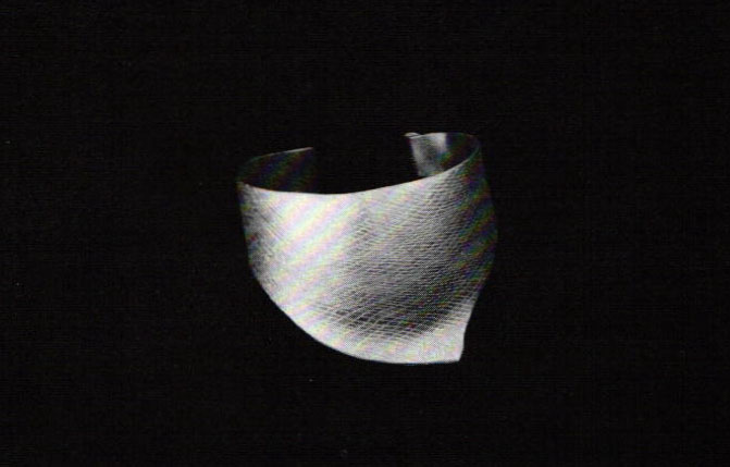 Pictures are Yvonne Arritt production jewelry; pins, cuffs, and Scarf Swirl collar, cuff and earrings, sterling silver; roll printed and formed. Photos: Betty Helen Longhi.