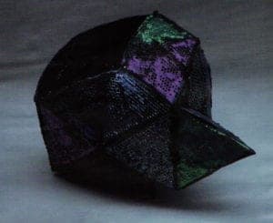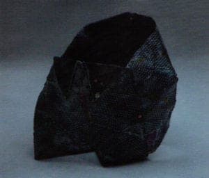 Origami forms are often symmetrical, can involve more than one piece of paper and have been created with metallic papers of beautiful designs. Some are shaped as boxes, which Americans might define as "vessels" as they are enclosures with an opening. Alana mentions that "a vessel implies an inside/outside. That's what I like to work with. Because my enameled mesh vessels are not functional, they could also be considered sculptures". She adds with dry wit, "it would be pretty hard to keep any liquid inside these".