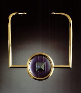 There is also wit in MacNeil's jewelry. A 1992 Neck Collar of gold-plated brass set with cabochons of colored glass evokes the Middle Ages, but it looks like a caricature of a necklace for a Dark Age princess or even a crown if it were turned upside-down. But it is not just a joke. In the medieval period, it was common practice to set jewelry and reliquaries with glass gems so MacNeil's strategy has a venerable precedent. The idea of necklace/crown also refers to the tiara russe, which could be worn both ways. Based on the traditional kokoschnik, the form originated in the Russian court.