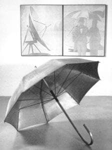 Pray for Rain, 1989 displays an enormous copper umbrella which lies on the ground in front of a wall-mounted, montaged blueprint. As in the other multiple pieces works, a polyphonous dialogue occurs between the separate elements, producing neither an interpretation nor a translation, but a rich resonance. The viewer immediately relates associatively to the object, regarding it as a valuable tool used to protect one from the elements of sun and rain, for leisure and golf outings. Yet it becomes a hothouse hybrid of a once useful object. Because of its size and material, it is ineffectual for any utilitarian function.