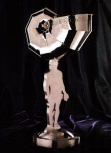 The artist, aware of her visceral pleasure in working the silver, was also ambivalent about using such a precious material as: "using silver in the gallery world brackets oneself into a relation based predominately on exchange value, and the dictates of wealthy collectors." This personal conflict, share by many metalsmiths, informed the conception of Product with the Influence of Custom. Norton's deliberate and unabashed use of sand-blasting sterling silver to reveal the internal human guts of the trophy/man, however contrived and idealistic they appear, subverts both our historical and contemporary reverence for only that which is mannered, expensive and appears to achieve excellence. The selected texts allow the artist to "beat around the bush" and be purposefully oblique with language; effectively reinforcing and contradicting both our own assumptions, and the form (trophy) of the work itself.