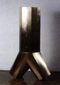 Made by the techniques found in ductwork, Torso of a Young Man, 1990, in elevator bronze, transforms a Y-joint, which is a transition duct, into a modern monumental, Brancusi-like torso shape. Here, once again, Norton asserts a re-consideration of utility, human worth, physical, psychological and philosophical value. All the while, a tongue is planted in the artist's cheek because the viewer's reading of a vessel form is that it traditionally references a woman - a pun on modernism, a pun on text, a pun on surface decoration in general, and a twist on the belief of language being based in authority and male power. Paradoxically, Norton, in her use of these male techniques, pays tribute to the sheet metal workers in Cleveland, whom she befriended, These men, who have gone unheralded, are consummate craftsman, but neither their media nor their names have been enshrined.