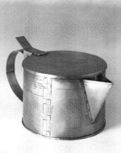 Over and into the diagram she inscribed a series of aphorisms which quote a variety of anonymous, yet, familiar-sounding sources. The words speak from two distinctly different points of reference, which are revealed not only by the style of the language but also by the style in which they were written into the metal. As an example, Cheap Project with Heroic Appeal, 1986, is a tin and steel water pitcher whose exaggerated stature of 20 x 18" aggrandizes and mocks function as a paradigm for industriousness and pragmatism. Phrases such as "IN THE ENVIRONMENT OF SERIOUS LIVING THERE IS LITTLE ROOM FOR THE NOVELTY OF TEMPORARY APPEAL" and "A STRAIGHTFORWARD JOB" are stamped into the metal, letter by letter. Another voice, subtlety and non-authoritatively pondering the nature of design and technique, has been etched in a handwritten text. The texts not only intellectually challenge both the utility and the context of the work, but the specific act of reading them puts many viewers in an awkward place where, through the vehicle of cognition and interpretation, they are forced to engage with the piece. This series of works, through its focus on utility in relation to human value and inventiveness and the introduction of multiple authorities through disparate voices both diagrams the making of the piece and foregrounds and textualizes the process of assigning meaning and value.