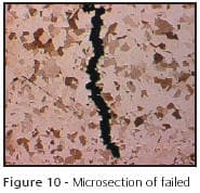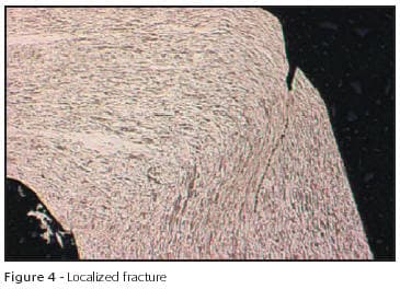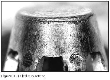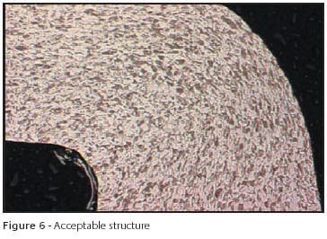 Ductility is critical when deep drawing findings components. Hoover & Strong manufacture a range of cup settings that are stamped as a one-piece item from rolled sheet. A suitable shape is flat blanked and then inserted into a tool set. It then undergoes several deep drawing operations to form the finished component. If the sheet supplied does not have maximum ductility for any reason, failure will occur at the base of the setting, Figure 3. Microsectional examination reveals the structure of the stamped sheet does not exhibit recrystallization, suggesting the stamped sheet was in the cold worked and not annealed condition, Figure 4. Fracture has occurred where the wall of the setting shows excessive local deformation, far greater than in the remainder of the section. Where correct temper mill stock is used, even flow can be seen in the base area due to a fully recrystallized structure being present prior to deep drawing, Figures 5 & 6. The correct resolution to this problem is to ensure the mill stock conforms to specifications before starting the job.