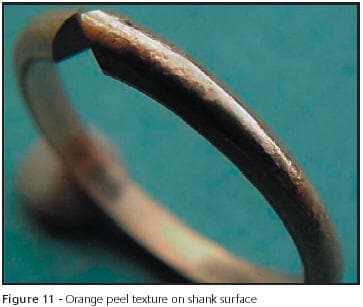 Some annealing defects may be the result of relatively simple problems. A component may have been annealed for too long or at an excessively high temperature, or a combination of both. This will generate excessive grain growth and result in an orange peel textured surface when deformed, which can be difficult (and sometimes impossible) to finish to an acceptable standard. Most cases of "over-annealing" are as simple as this, but in some cases further investigation is required to identify the root cause. Case study 5 again involves a solitaire shank. There is an orange peel surface texture becoming evident when formed into the final shape, Figure 11.