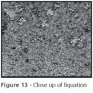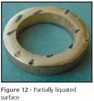 Always be aware of the obvious. This washer has undergone a pre-forming anneal and "did not appear right", Figure 12. It was immediately obvious that the component had been overheated during the annealing operation. Marks from the furnace belt can clearly be seen, along with partial liquation at the surface, Figure 13. Annealing furnaces must be periodically checked to ensure the control systems are within calibration. Process related problems.