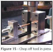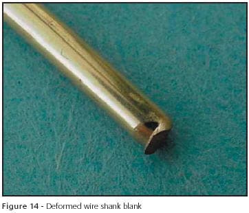 Incorrect set up of tooling accounts for over 30% of tool failure and is easy to avoid if care is taken to follow a few simple rules. In Figure 14, a hook was formed at the end of a shank blank. The distance between the cut off blade and the block caused this defect. In this case the clearance is too great. As a result, the tool lost much of its shearing action and actually began to form the end of the wire before it cut off. The clearance required is governed by the formula, presented earlier in the Gold Technology article on stamping (7). When clearance is required, a shim or feeler gauge should be placed between the two tooling components and removed when tightened. Also, frequent checks of the set-up during operation will prevent changes from ruining a job.
