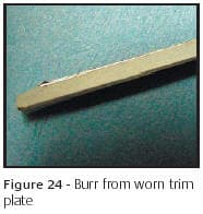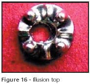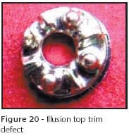The illusion top in Figure 20 is normally run with thousands of identical parts. Like the shank in Figure 19, it too was partially placed into the trimmer plate but in this case, the tool was not damaged. It drops through a trim plate into a drawer filled with many other parts and can become difficult to separate from acceptable parts. A cup or container is usually placed in the machine bin to be emptied numerous times during such a run. This way, the defect may be discovered before it's buried among hundreds of similar parts.