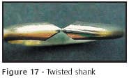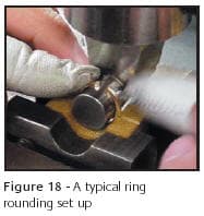Shanks sometimes develop a twist in them, Figure 17, that's referred to as snaking. This is the result of rounding arbor-to-bending block misalignment. Figure 18 shows a common shank rounding set up. When the arbor is not square to the bending blocks groove, the forming will favor one side, resulting in the formation of a mild helix. When the ends of the shank are aligned by hand to attempt to correct this, the entire ring is distorted beyond repair as seen in Figure 17.