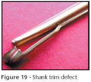 Correct placement of pieces into stamping, trimming or piercing dies is essential to success. In the examples shown in Figures 19 and 20, the parts were not fully seated in the trimmers. This caused extreme damage to the findings and exposed the tools to excessive abuse. The part in Figure 19 was partially positioned in a trimming tool. The tool was damaged as a result of the punch and plate being driven out of alignment. An obvious defect such as this would never make it past the next step before being detected.