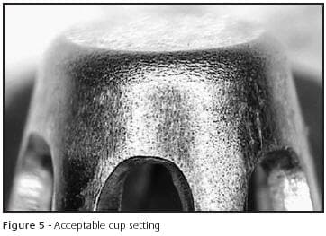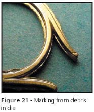 Figure 21 is a good example of a metal flake in a die marking the surface of a finding. In this case, a small piece of gold was resting on the bottom of the die when it was cold forged. The results can be seen in the form of an impression being made on the end of the prong. The operator failed to see the debris and continued to strike the parts resulting in most of them being marked in this manner. Die striking tools should be visually inspected after each strike and must be clean and free of any metal flakes or dirt.