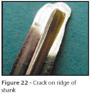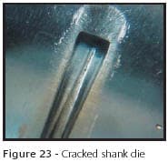 Three things can affect the usable life of tools and dies. These are damage, poor craftsmanship and wear. As said above, careless set-up and operator error can destroy the best tools. Poor craftsmanship can manifest itself in many ways. Flaws in steel or heat treatment can cause premature failure. The same can be said for choosing the wrong steel for a specific application. Cold forging dies require impact resistant steel such as S7 grade while using O2 steel for cup setting forming tooling is a good choice. However, if O2 steel is used for cold forging die blocks, the results will be less than acceptable tool life. Also, the design of a part can limit the life of a tool and this is illustrated in Figures 22 and 23. The sharp ridge along the top of the shank has caused the die to fail quicker than a more rounded design. In this case, the die has cracked along the ridge and in extreme cases, the die can split in half. The shank acts as a wedge and exerts great force within the cavity and can be very much like splitting wood if not properly annealed.