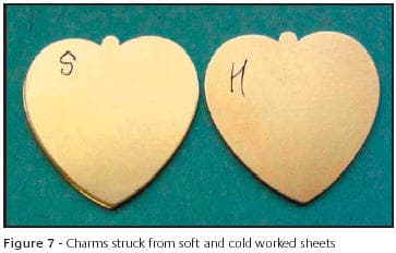 When die striking, it is not always advantageous to have mill stock in the annealed condition, particularly when a blanking operation is involved. To get a crisp, burr-free cut edge, strip is best cold worked to a certain degree for the optimum results. If the strip is too soft, a burr can be created by excess metal movement into the clearance gap between punch and die. Poor edge retention is also a common problem, as demonstrated in this example of a die struck charm, Figure 7. The edges are clearly "beveled" as a direct result of the material being too soft.