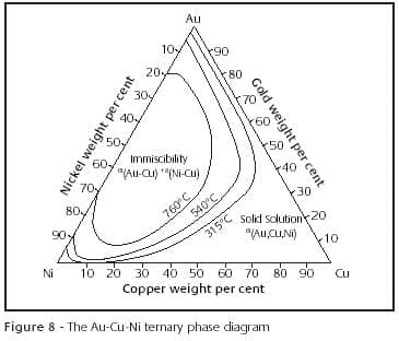 If bands are being manufactured from a general purpose yellow karat gold with negligible age hardenability, standard rolling and annealing techniques can be used to produce the mill stock. If, however, the composition of the alloy requires specific heating and/or cooling cycles, care must be taken. The example used here is of a blank stamped from a high nickel-containing 14kt white alloy. The metallurgy of nickel-white alloys is well documented and does not require re-iterating in this text (1-4). However, it is important to note that alloys containing high percentages of nickel, in particular 14kt and 18kt, undergo segregation. A solid state immiscibility field occurs in the Au-Ni binary system below 1510°F/821°C that influences the Au-Ni-Cu ternary relationship, particularly in the compositional ranges of commercially available 14kt nickel white alloys, Figure 8. As a result, the high nickel-containing alloys are intrinsically harder than standard yellow or low nickel-containing alloys and will work harden at higher rates.