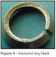 The ring blank in this case study has failed on sizing. Incorrect annealing and insufficient cold work during processing has resulted in the washer being less ductile, resulting in less tolerance to deformation. There is also some evidence of internal intergranular quench-related cracking present. It has withstood a minimal amount of deformation, but when stretched over one size has failed, Figure 9. Microsections confirm the failure mode, Figure 10.