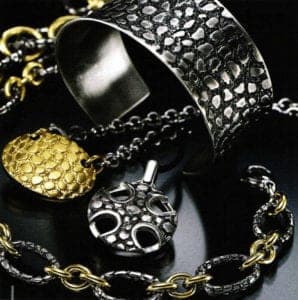Flambé The modern surface design takes its name from the French word flamber, which means to braise, to singe or to enflame. This technique was already used by Fabergé goldsmiths, who called it "Somorodok Gold". In it, the sudden application of cold to an almost molten gold creates a surface resembling a natural gold nugget. This style of jewelry was rediscovered in the jewelry styles of the nineteen sixties. Flambé is often the basis for various other surface techniques such as sulfurization of silver objects, enameling or dyeing, etc.