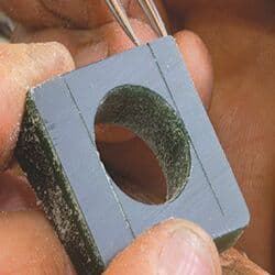 - The first step is to create the blank. I like to use the 1 1/8-inch square bars because they give you a good start to being centered due to their geometry. In addition, because they are not pre-formed in any type of ring shape, they give you complete freedom to explore your creative muse. Saw the slab slightly wider than the total width that you want the finished ring to be.