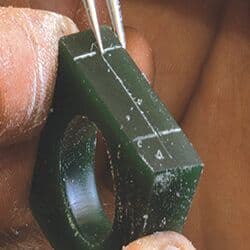 - Then use the divider again to find the midpoint on the midline that lies between your previously scribed extended finger-hole edge lines. The single point will be the top dead center of the finger hole. You can use this point for gemstone placement or as a reference point for all of the carving on the ring.