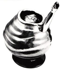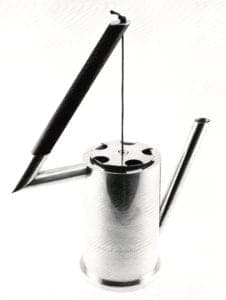 A small tea pot named Madhatter's Tea Party, like the statuesque silver coffee pot, is a showpiece in the geometric manner. It, too, hides materiality behind design. But under the lid, inside the pot, is a doormouse, guest and critic at the original "Madhatter's Tea Party," guest and critic of this one. It is startling or delightful, according to one's inclination. The doormouse is an organic object inside a geometric object and its natural quality counters the cerebral geometry of the container.