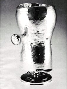 Tot Cup for an Insomniac fully bridges the gap between playful effect and the seriousness of tradition and workmanship. Clearly masterful in its making, it has a whimsical quality couched in its tipsy form and springy protuberances and a late-night, other-worldly quality in its perforated texture. It is a 20-century equivalent of the kind of serious, but exuberant. precious metal objects of centuries past that were masterpieces of technique festooned with mythological figures and the abundance of nature.