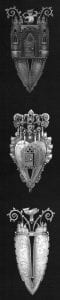 Some of Talcott's pieces are quite literal. Her 1994 Untitled brooch features a heavy half-timber door embedded into the front of a heart shape. Vines and tendrils encircle the door, protecting it from encroaching flames. On the back of the piece is engraved a 13th century poem in Old Icelandic. It tells the story of a woman riding with her husband and describes briefly the woman's attire, which includes the keys to the storehouses. "The keys represent the woman's responsibility to regulate food for the entire farm", explains Talcott. "The farm's reputation, and the reputation of your family was at stake. Reputation was the most important thing to these people, more important than the display of wealth. Back then you were known by what kind of woman your mother was, and her mother before her; and the things you did would affect your children and their children. It wasn't like today, where we can re-invent ourselves." On the front of the brooch, the door swings wide to reveal emptiness. The piece is decorated with barley kernels, traditionally a symbol of fertility, and on the back, a small key which unlocks the power of family reputation, the burden of family responsibility. Talcott calls this piece her minimalist piece, "because there are only 20,000 things going on".