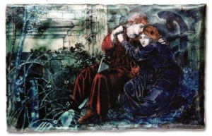 The Art Enamelers, who followed the influence of the leaders of the pre-Raphaelite artists, and notably the designs of Dante Gabriel Rossetti, William Morris and Edward Burne-Jones, emphasized the colors and symbolic qualities of their pictures. The enamel plaque of 'Love Among the Ruins' retains the mysterious quality of the Burne-Jones composition, with its distinctive face painting. The use of clear blue enamel over white, for the background for the figures, adds depth. Where the blue is fused over shaped paillons of silver foil, this produces the glitter of moonlit leaves and sparkling water. With the changes introduced in the enamel copy, the faces have a slight tint, and thus appear more naturalistic than the pale, and even wan images that were favored by Burne-Jones for his artwork in the 1870s. The robes of the figures are given eye-catching color with the enamels. The Burne-Jones picture was first created in 1873, as a watercolor work, and was described by contemporaries as 'a most beautiful composition'. Unfortunately, the watercolor version was destroyed by accident. The picture was recreated as a large format oil painting by the artist 20 years later, and was exhibited in 1894, which was also the year that he was made a baronet. It is among the narrative compositions that represent Burne-Jones' credo, stated in writing to a friend: "I mean by a picture a beautiful, romantic dream of something that never was, never will be - in a light better than any light that ever shone - in a hand no one can define or remember, only desire - and the forms divinely beautiful". The enamel painting that was inspired by the original picture, despite the reduced format, retains this dreamy, tantalizing quality.