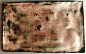 For this enamel picture, a few technical problems arose due to the use of a flat, rectangular copper plaque measuring 10 inches by 6-1/2 inches [c. 25.5 cm. x 16.5 cm.] The appearance of the counterenamel testifies to several stages of firing - perhaps 8 or more. With such a format and number of firings, the copper dished slightly where the glaze is thickest, and there is a little distortion of edges, due to the enameling process. The Art Enamelers worked towards the appearance of the image, to give 'meaning and originality' and accepted such minor technical imperfections, which they felt emphasized the complexity and individual treatment of such work.