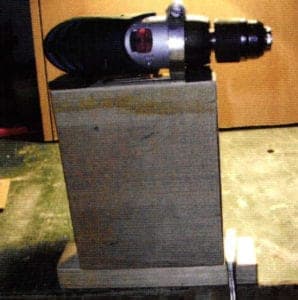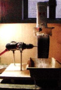 First, a WARNING! For this set-up NEVER use an electric drill that is connected to household power outlets. Splashing water could cause a short circuit and you could be shocked. Only use a cordless battery powered drill as described later in the article.