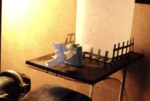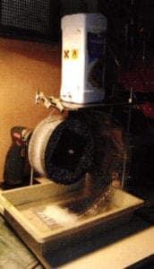 Enamel surfaces should always be wet sanded. In order to wet grind we need a water tank with a water outlet. When water drips onto the sanding drum as it turns, it splashes vigorously, so we need a splash gaurd, and to collect the water and grit we need a drip pan (Fig. 10).