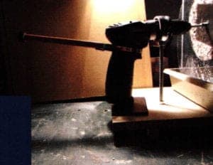 On most cordless drills the power button cannot be made to stay in the "on" position. I have found a slightly gimmicky solution. The screw cap opener "Strongboy" by Zyllis here is a big help. The thin steel band is wrapped around the switch. By tightening the rear Screw, the switch can be locked in any desired position (Fig. 12). The machine is ready for work (Fig. 13). The set-up has little weight so it must be connected to a workbench with bar clamps. The set-up is easily assembled or disassembled in a few minutes.