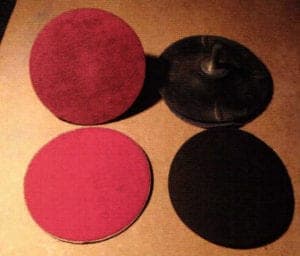 The other rubber disk and abrasive disks are armed with hook and pile fasteners (Velcro®, Fig. 14 top and bottom left). Both the abrasive disks and rubber disks are available in 5 and 6 inch diameters.