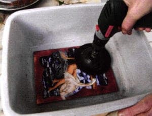 Lay the enamel plate to be ground into a shallow container. Fill with water until plate is covered (Fig. 15 for photo demonstration - no water in container). Abrade the enamel surface without pressure with the grinding disk.