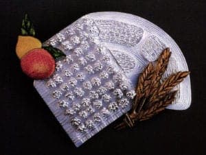 Each trip has inspired a different series. In her East/West/North/South series, Watson-Abbott juxtaposes symbols of various places to explore the contrasts found in the American landscape. These small brooches are images mixed and matched, resulting in often humorous and always perceptive visual ruminations. In North/South/MN/AZ, a miniature citrus grove reminiscent of those spread across miles of southern California sits adjacent to linear fields of Minnesota wheat. Etched in sterling silver with permanent markers for emphasis, green-leafed orange and yellow fruit frame the grove just as a golden brown shaft of wheat underscores its ridged field.