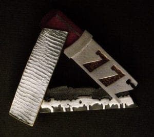 In Times and Places - Reno, one edge of a skeletal triangle has three 7s cut from its center, a reminder of the artist's $100 win in a 777 slot machine jackpot in Reno. A trilobite found in a small store along Highway 50 in Nevada has been worked into a wedge of fine silver. The colors of permanent markers echo those found in the landscape. Small pieces are based on minor incidents - enjoying a picnic in the Rockies, seeing lava beds for the first time - fragments of memories replicated in sterling, semiprecious stones and assorted metals.