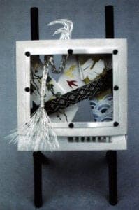 From this perception come such unexpected pieces as Japan - Tradition/Technology #3, a miniature picture framed in the Japanese style. Its surface, instead of reflecting a traditional landscape scene, shows a photo-etched vision of a compact stereo. In another, Japan -Tradition/Technology #2, a sterling silver state-of-the-art television set sits on a pseudo Japanese stand, its screen wrapped in strips of traditional fabrics and silk cords.