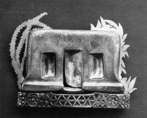 The symbols that frequent many of these pieces not only reflect the artist's personal recollections but also offer the viewer a sense of awareness - of a familiarity of place. In East/West/NE/NM the customs equated with two such diverse areas of the country as the southwest of New Mexico and the New England coastal plain of Cape Cod are combined imaginatively. Sterling silver clapboard eaves provide a background for cut-out silhouettes of buoys; a three-dimensional sea-blue and gold painted buoy hangs in front, while a stippled slice of sterling silver wall suggesting southwestern stucco abuts the clapboard; a hanging string of red-painted chili peppers completes the piece.