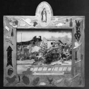 In Como? "Flecha Amarillo" a Prismacolor pencil drawing of adobe lean-tos covered with vegetation reflects the warm earth colors of the Mexican landscape. The wide wood frame is covered with brass cut-out objects, the artist's own milagros; a religious figure sits at the top center of the frame as if blessing the scene. Other pieces include a rain-swept patio complete with a three-dimensional umbrella, and a terra-cotta colored picture of a tiled sink framed in nickel silver, with tacks representing the Imodium tablets travelers in Mexico are so familiar with. The colors, the juxtaposition of three-dimensional objects echoing the two-dimensional objects in the drawings are all combined imaginatively to create the latest venue for the artist's keen eye and subtle sense of humor.