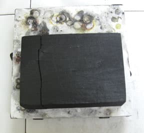 One common practice to extend the lifespan of a non-compressed charcoal block is to wrap it with a length of binding wire to keep it from splitting apart when heated. Also, Jurgen Maerz of Platinum Guild International told me that he employs an annealing step to help stabilize the block after binding it.