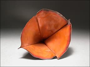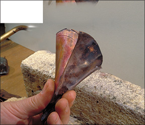 Here are three views of finished cups. The colors give an indication of where the tightness of the folds limited the access of oxygen. The black areas near the rim received the most oxygen, while the red areas received less. The inside of the cup is bright and clean because there was no oxygen present to react with the copper.