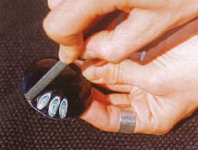 This article describes the steps on how to make an agate imitation cabochon. This technique consists of the successive application of silver foil sheets, changing the colors of enamels among them, and then to wear away sectors, and discover each one of the colors used in the different layers.