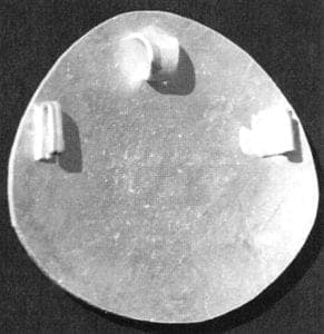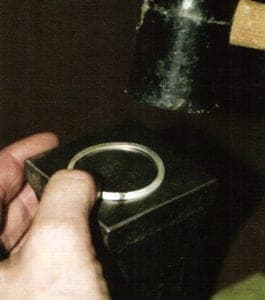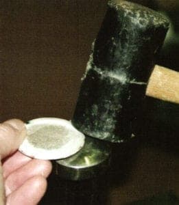 If you wish, you can now dome the work piece a bit. I prefer lightly domed enamel jewelry because I think it looks better, and it is much easier to stone a convex domed work piece. Dome it over a flat-round stake, (Pic. 9) but not in a driving block!