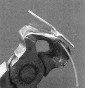 Fold the strip over, so that one part is a bit longer than the other (pic. 10a), so it is easier to bend both ends apart later. Put the needle wire into the folded silver strip. For the needle, use a 0.6 - 0.8 mm round stainless steel wire. Firmly press the folded strip around the needle wire with flat-nose pliers. The wire should sit as firmly as possible (pic. 11). The needle bearing should be about 3-4 mm over the enameled back. To get the right height, set the nippers directly underneath the needle bearing and bend the two supernatant ends of the metal strip right-angled outward. Shorten both ends to approximately 5 mm.
