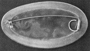 After enameling the supernatant edge of the brooch frame is filed off and the enamel and the silver get stoned and polished. After that, make and fasten the needle. Cut up a piece of stainless steel wire that is about 5 cm longer than the distance between needle-mount and the hook. Deburr one end very well. Bend this end into a loop. Push the needle from downside into the needle mount. Bend the needle as scarcely as possible over the needle mount toward the hook. Cut the needle off in such a way that it exceeds about 1-2 mm over the hook. File the point to the needle (see Pic 12).
