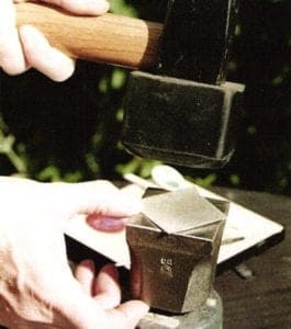 Now you can prepare the silver sheet. The sheet metal should be about 5 mm larger than the framework, all the way around. If you want to have a textured surface you should create it now. You can structure the surface with the hammer fin, a ball pointed hammer, or you can engrave or make a texture with your rolling mill. (Pic 6). After that, anneal the sheet and the rim, and flatten both very well on a flat anvil. For this you can use a heavy lump hammer. Protect one side of the hammer with a rubber cover, so that the sheet and the rim do not become damaged. (Pic 7)