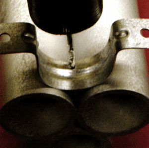 After drying for an hour your can paint over the glue. If you paint with a glossy paint any drops of cement accidentally spilled on the tubes or any unevenness in joints will show, so I used a hammer finished paint. Allow to set over night for the paint to dry and the glue to completely cure. Next, I laid the conduit strap 1/4-in from the open end of the pipes. The drilled side of the conduit strap was toward the closed end of the pipes. I drilled a pilot hole for the 1 5/8″ dry wall screw with a 7/64″ drill bit.