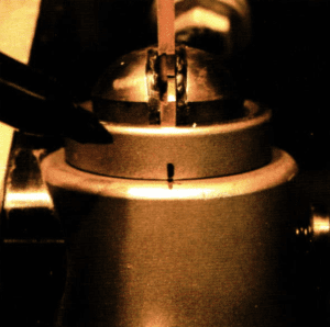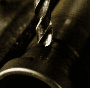 Remove the insides of the ring holder and mount the tube body in a vise. Drill out the four marks on the ring holder tube body with a 5/16 drill. If you stop just short of going all the way through, there are no burs to cleanup on the inside of the tube. Leave just a tiny rim like in a bezel setting. If you go all the way through, clean up the burs on the inside with a large ball bur.