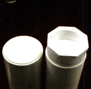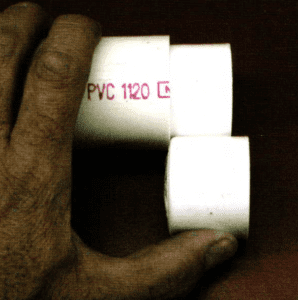 If you don't have any flat PVC you can use end caps. Use 1″ end caps for the 1 1/2″ pipe. Apply a small amount of cement to the end of pipe and tap the end cap into the end as pictured with a rubber mallet. Make sure you have a good cement joint. Use a syringe with the needle removed to run a neat bead of cement. Let dry 30 min.