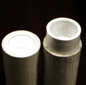 The 2″ pipe has to be cut 1/8″ past the end of the pipe because the end cap doesn't actually protrude into the pipe. The finished product is still a well-sealed pipe but not as neat looking as the 1-1/2″ pipe. The tubes are now ready to be cemented together. Rubber band them together, fill a syringe with the needle removed with pipe cement, and run a neat bead down all the joints. Wait 30 minutes to dry. If you're doing four tubes, cement them together two at a time. After they dry cement the two sets of two together and they will fit better. If you try to glue all four at once they shift and make a mess.