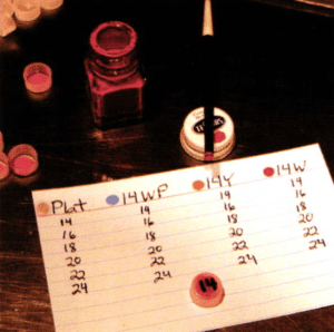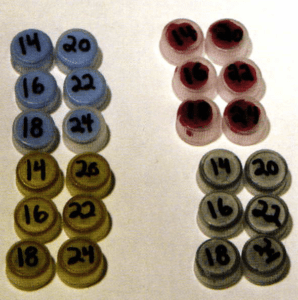 Decide on colors for your wire tube caps. I used yellow for yellow gold, white for white gold, silver for platinum, and blue for sterling. Write backwards inside the caps the wire gauge sizes. I used 16 to 24 gauge using only even sizes.